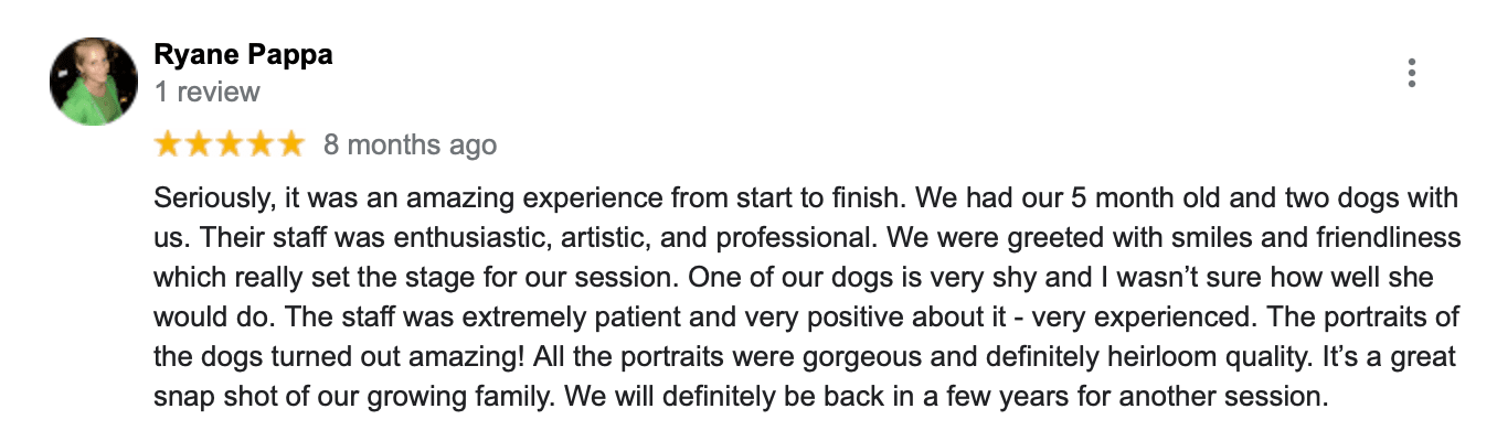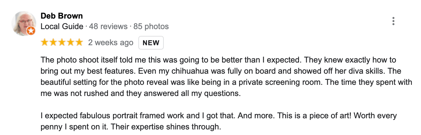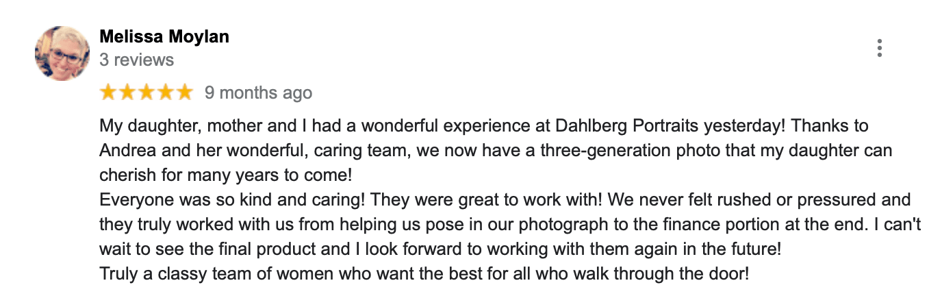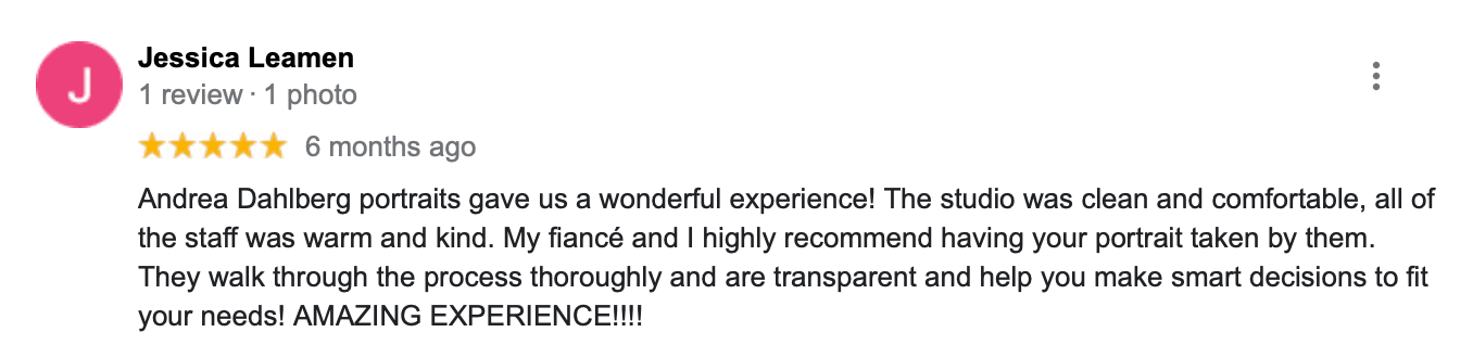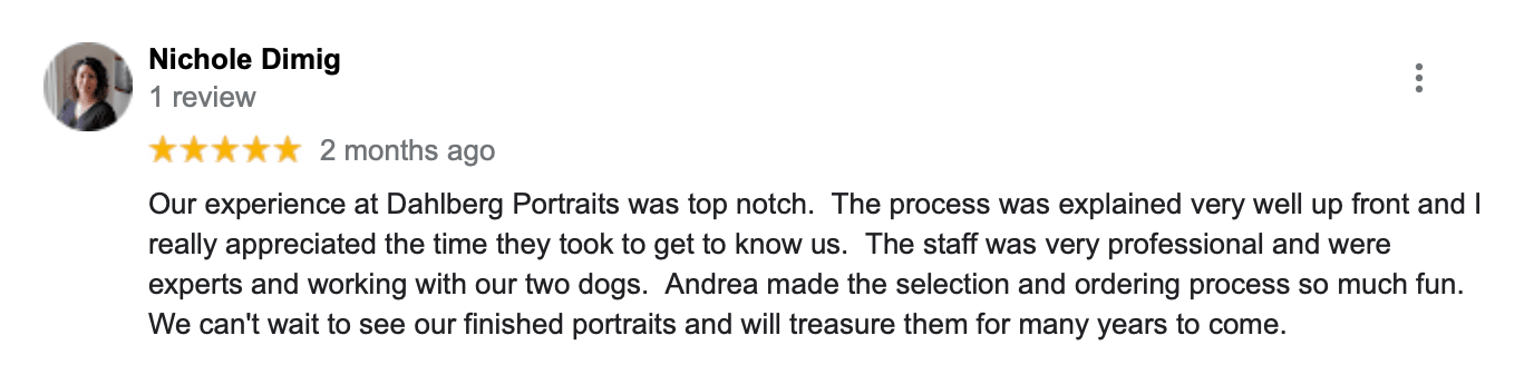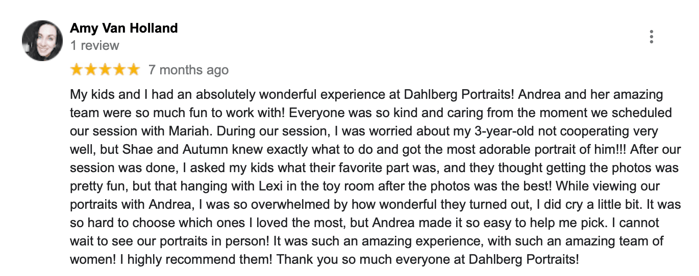 Plan for 2 Hours: Your whole experience at our studio will be about 2 hours, so please plan for that. Your portrait session takes about 30 minutes. Then there is a break as we prepare your images to see. And your selection time with our Art Director takes 45-60 minutes.